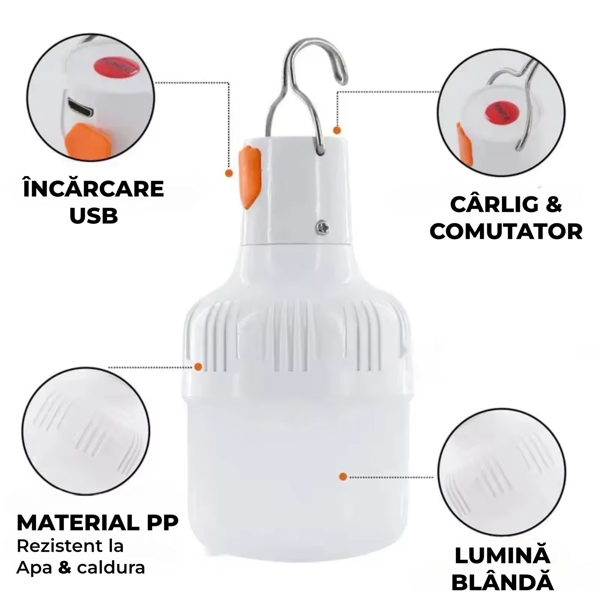 Iluminează rapid și eficient orice spațiu cu acest bec LED portabil, reîncărcabil prin USB, conceput pentru utilizare versatilă atât în interior, cât și în exterior. Este soluția practică pentru camping, terasă, piețe, ateliere sau situații de urgență, oferind lumină puternică într-un format compact și ușor de transportat.