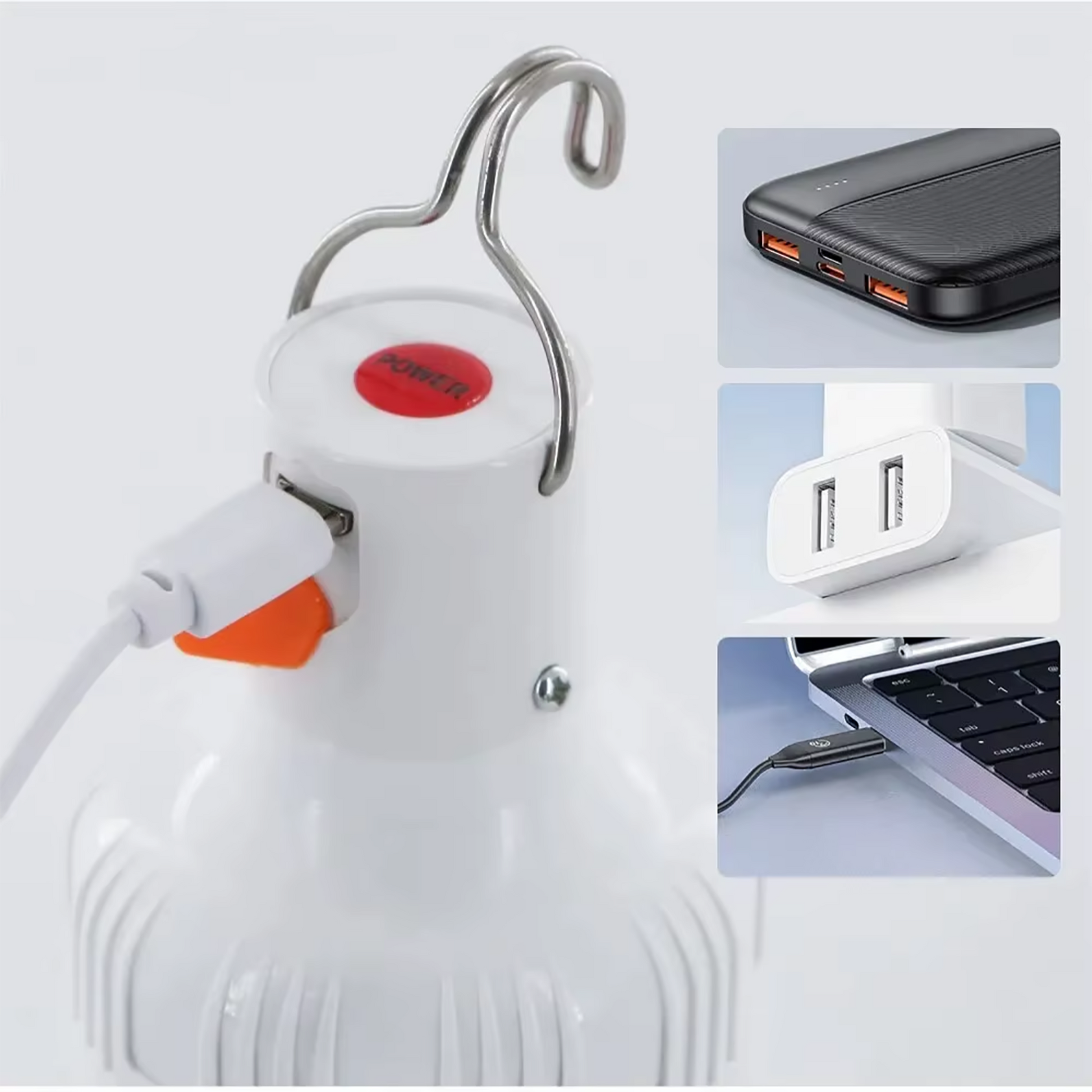 Designul portabil cu agățătoare integrată permite suspendarea rapidă în cort, pe verandă sau în spații de lucru, fără instalare complicată. Alimentarea prin USB asigură compatibilitate cu power bank-uri, laptopuri sau adaptoare auto, fiind ideal pentru deplasări și pene de curent.