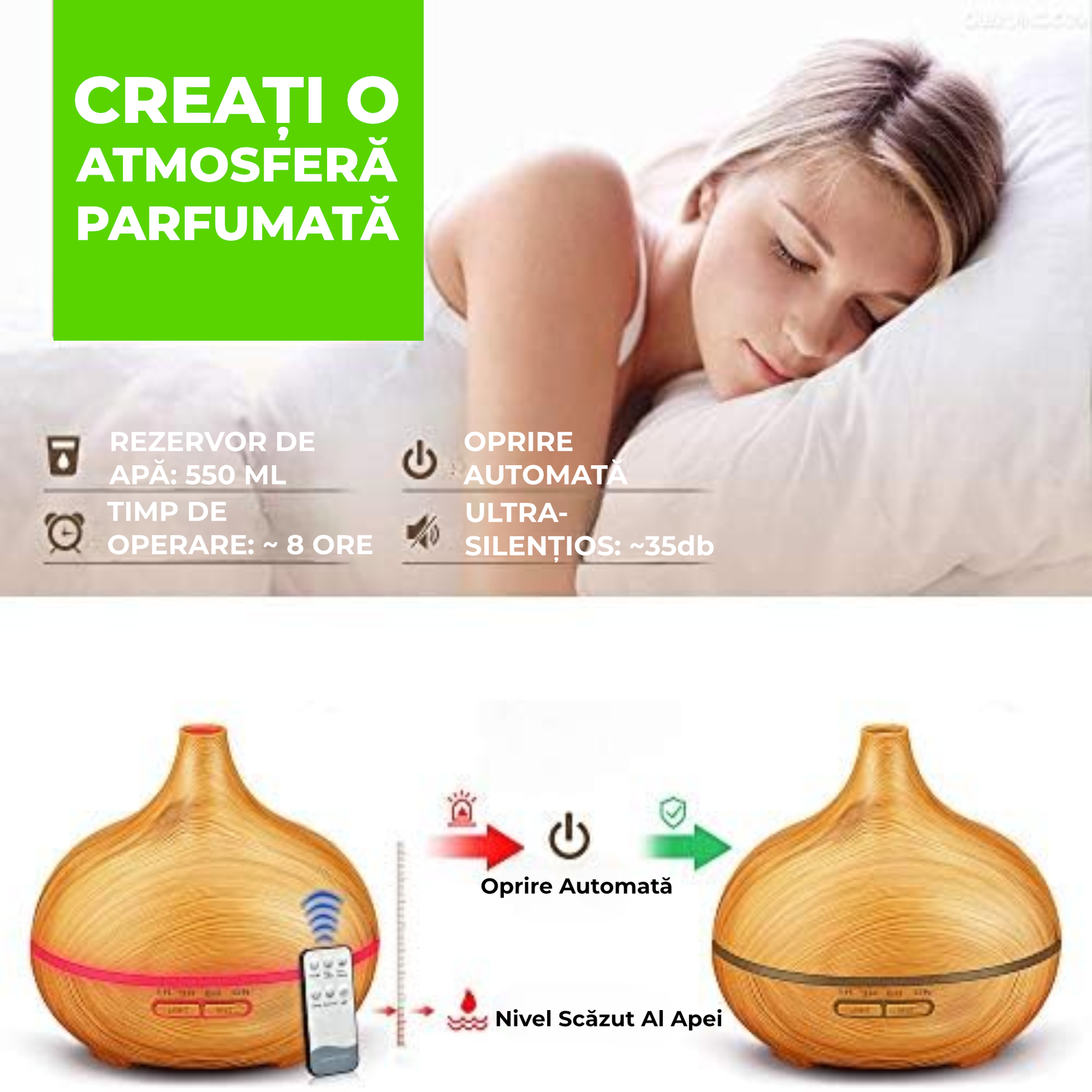Umidificator aromaterapie cu ultrasunete 550 ml, LED RGB, timer și protecție lipsă apă – design lemn deschis